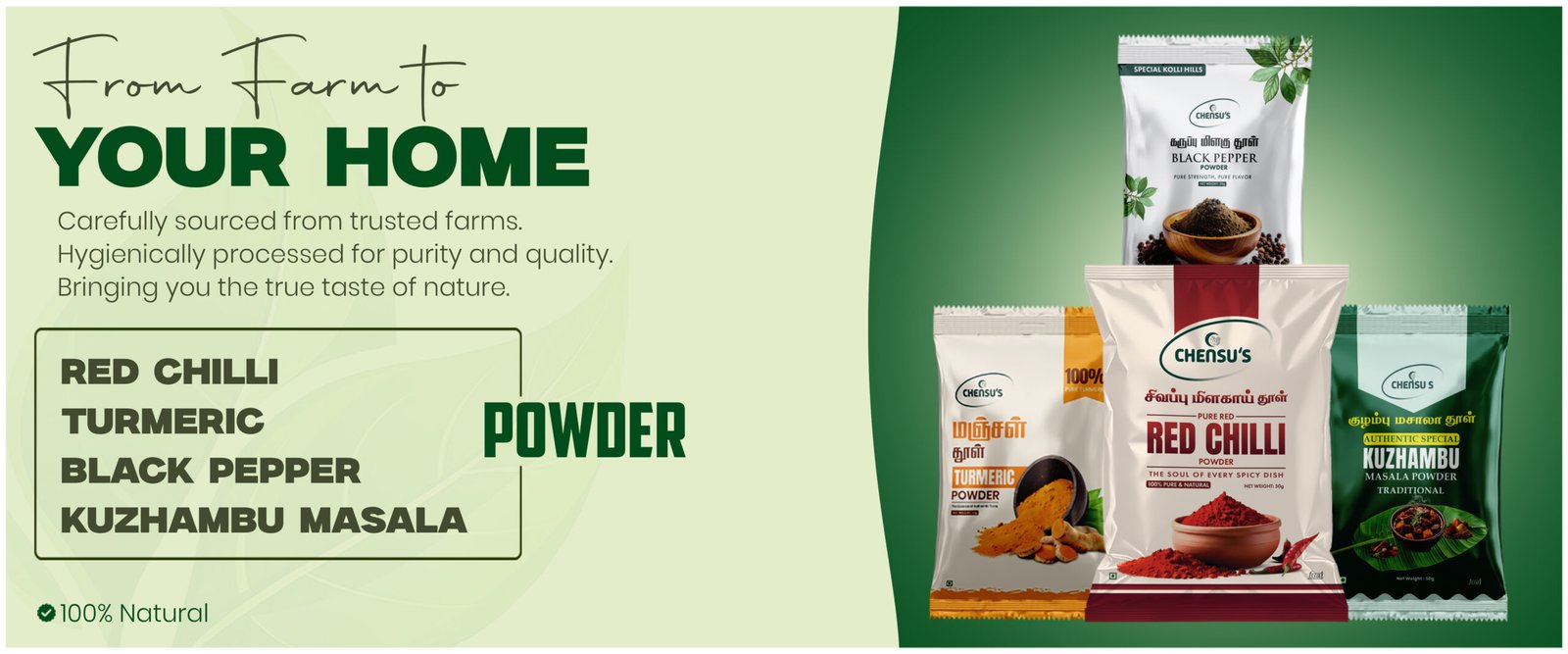 At Chensu’s Foods, we bring you naturally prepared spices, health mix powders, oils, and dehydrated vegetable & fruit powders. Our products are carefully processed to retain authentic taste, rich nutrition, and freshness, helping you and your family live healthier every day.